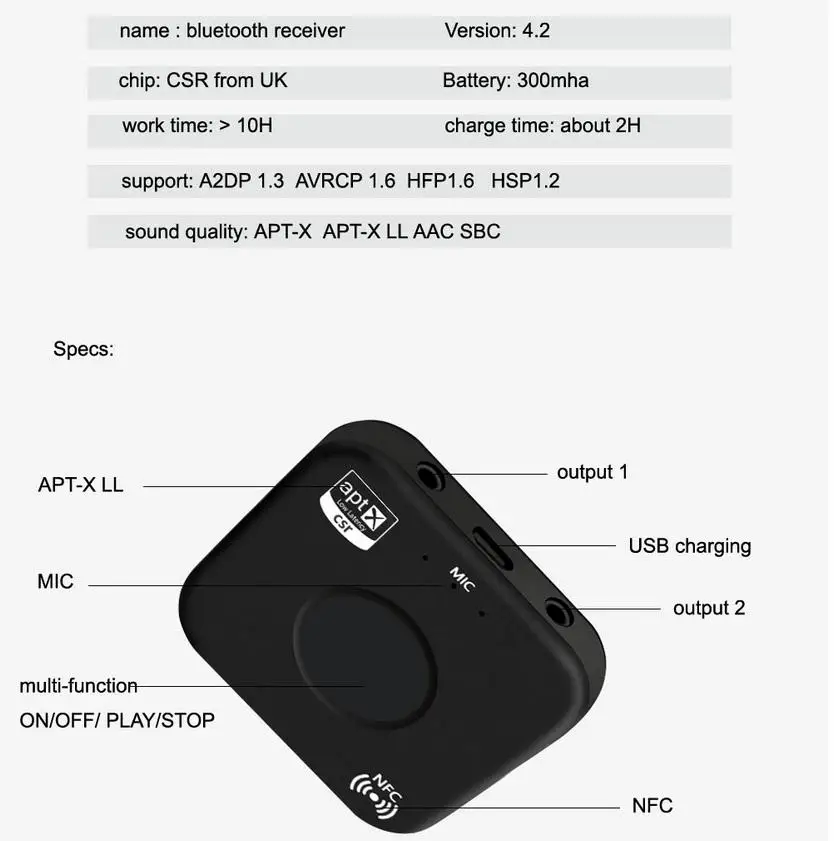 TOP Bluetooth 4.2 Receiver aptX LL Low Latency Dual Port Audio NFC Music Adapter for Laptop Phone Car