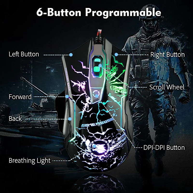 KAYINUO mechanical usb gaming mouse 3200DPI adjustable 6 buttons rgb colorful backlight usb/compute